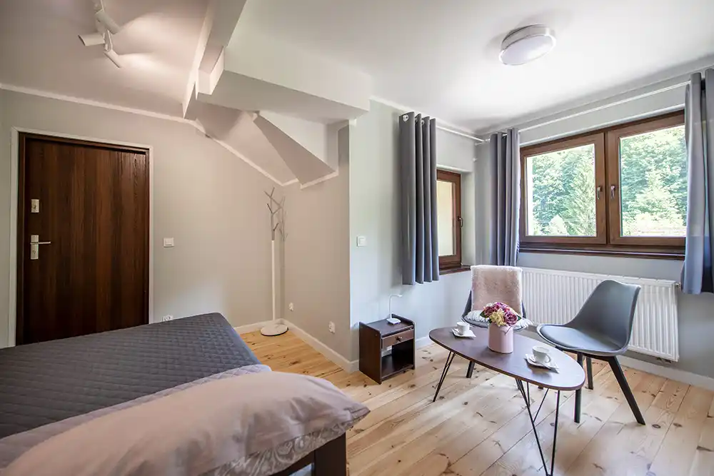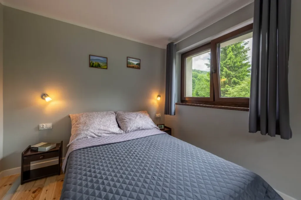 - Duży pokój dwuosobowy (15 m²) z podwójnym łóżkiem.